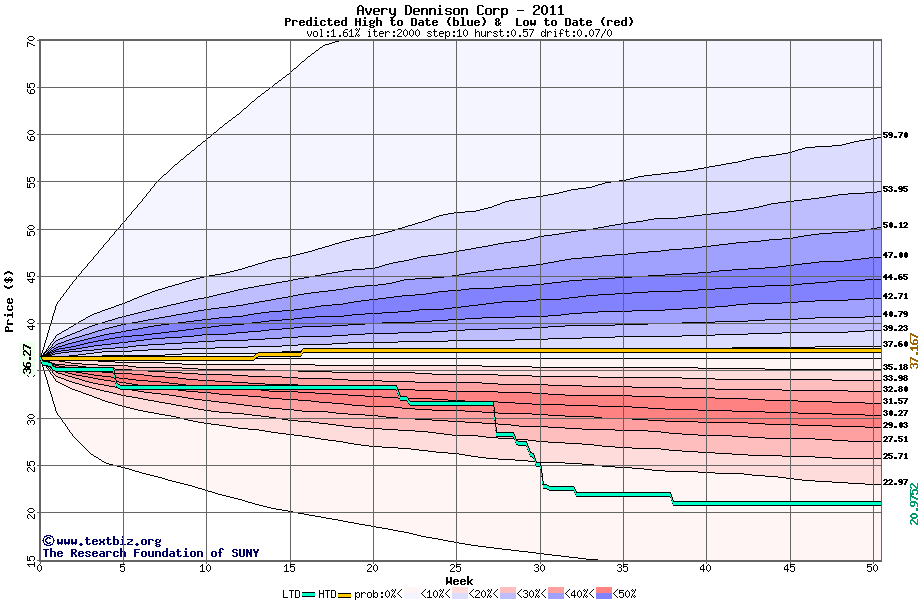 The high to date and low to date prices of the stock plotted against a random walk model for 2011 (what's this?).