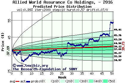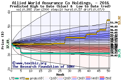 The high to date and low to date prices of the stock plotted against a random walk model for 2016 (what's this?).