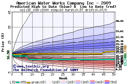 The high to date and low to date prices of the stock plotted against a random walk model for 2009 (what's this?).