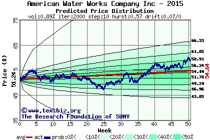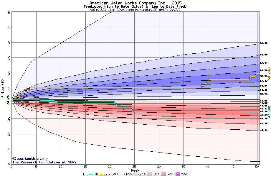 The high to date and low to date prices of the stock plotted against a random walk model for 2015 (what's this?).