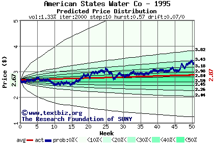 The high to date and low to date prices of the stock plotted against a random walk model for 1995 (what's this?).
