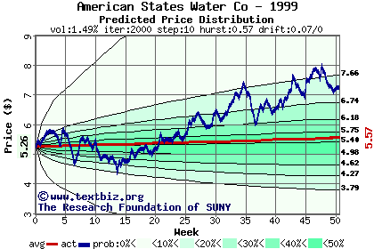 The high to date and low to date prices of the stock plotted against a random walk model for 1999 (what's this?).