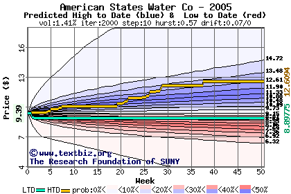 The high to date and low to date prices of the stock plotted against a random walk model for 2005 (what's this?).