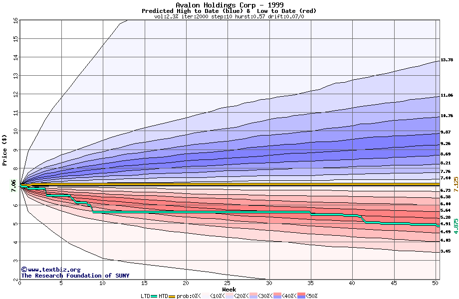The high to date and low to date prices of the stock plotted against a random walk model for 1999 (what's this?).