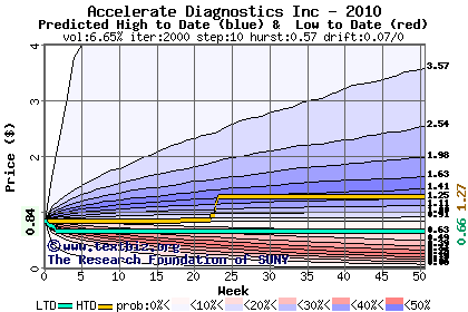 The high to date and low to date prices of the stock plotted against a random walk model for 2010 (what's this?).