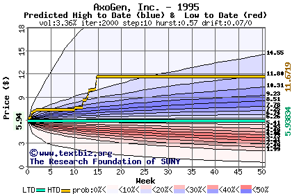 The high to date and low to date prices of the stock plotted against a random walk model for 1995 (what's this?).