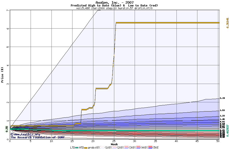 The high to date and low to date prices of the stock plotted against a random walk model for 2007 (what's this?).