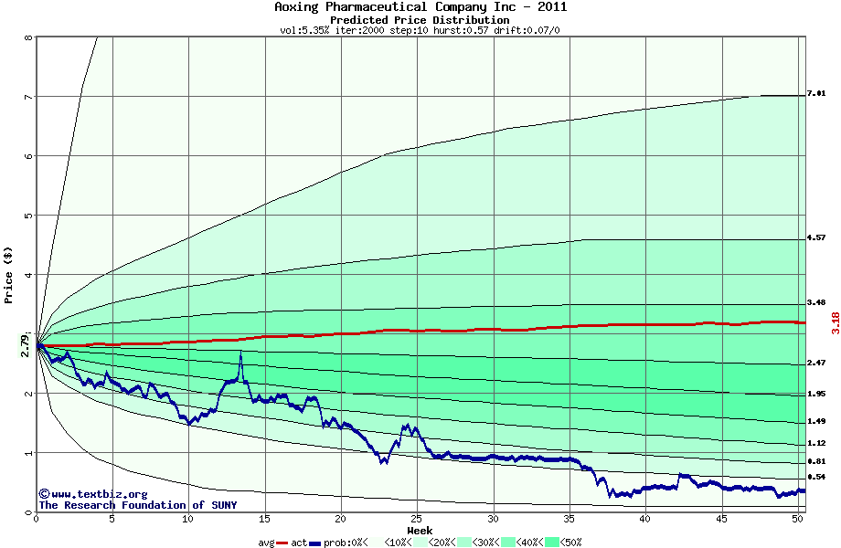 The high to date and low to date prices of the stock plotted against a random walk model for 2011 (what's this?).
