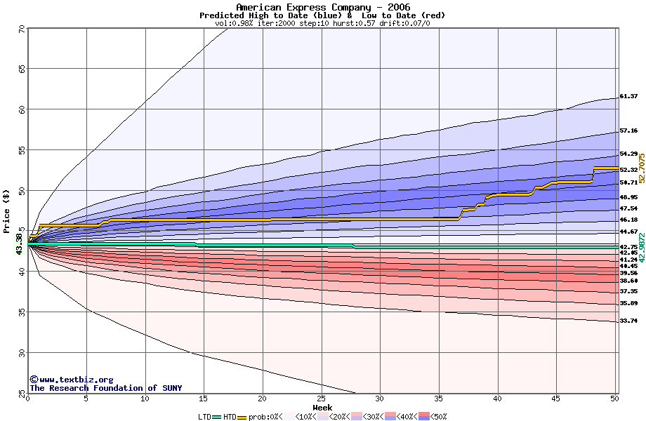 The high to date and low to date prices of the stock plotted against a random walk model for 2006 (what's this?).