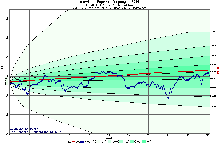The following graph plots the year-to-date performance of the stock for 2014 compared to the probability calculated by a random walk model.