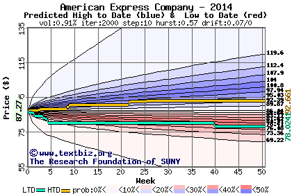 The high to date and low to date prices of the stock plotted against a random walk model for 2014 (what's this?).