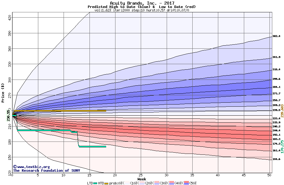The high to date and low to date prices of the stock plotted against a random walk model for 2017 (what's this?).