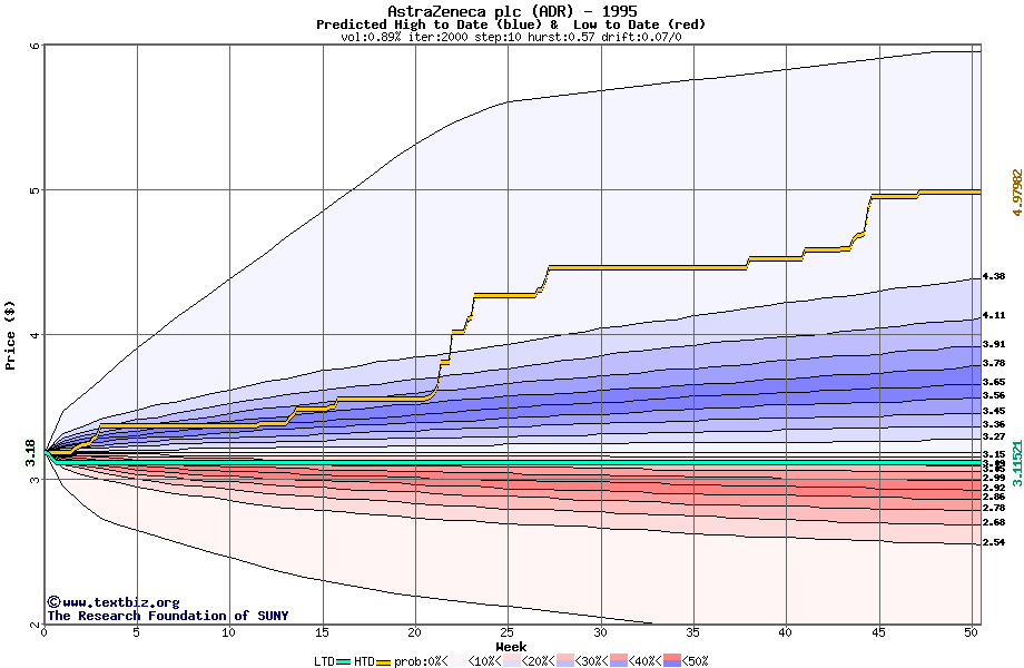 The high to date and low to date prices of the stock plotted against a random walk model for 1995 (what's this?).