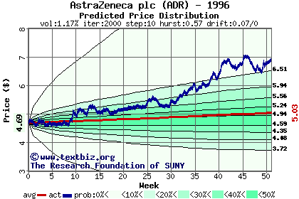 The following graph plots the year-to-date performance of the stock for 1996 compared to the probability calculated by a random walk model.