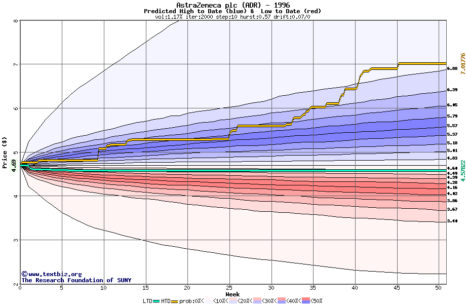 The high to date and low to date prices of the stock plotted against a random walk model for 1996 (what's this?).
