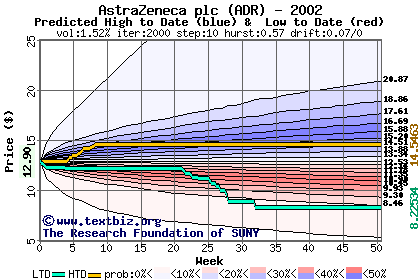 The high to date and low to date prices of the stock plotted against a random walk model for 2002 (what's this?).