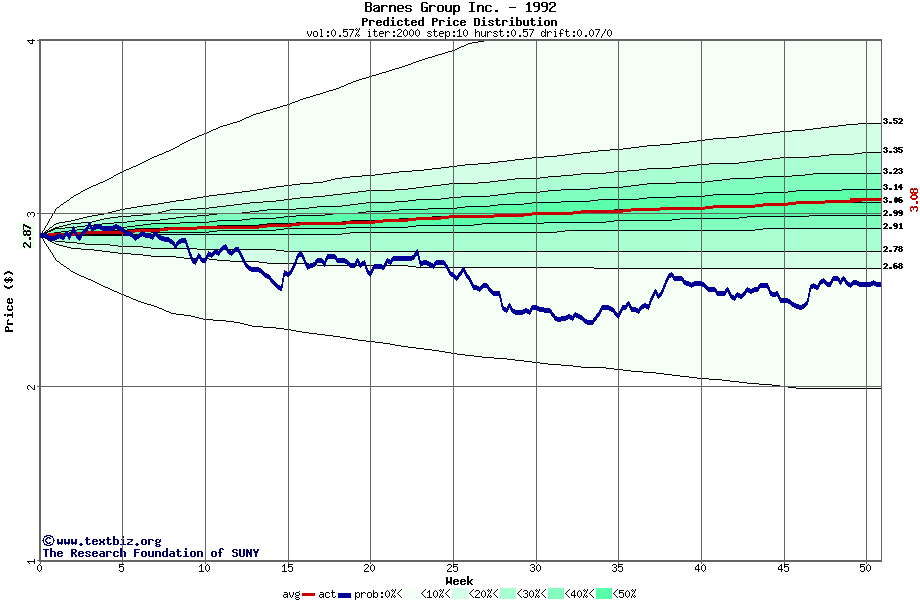 The following graph plots the year-to-date performance of the stock for 1992 compared to the probability calculated by a random walk model.