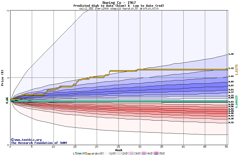 The high to date and low to date prices of the stock plotted against a random walk model for 1967 (what's this?).