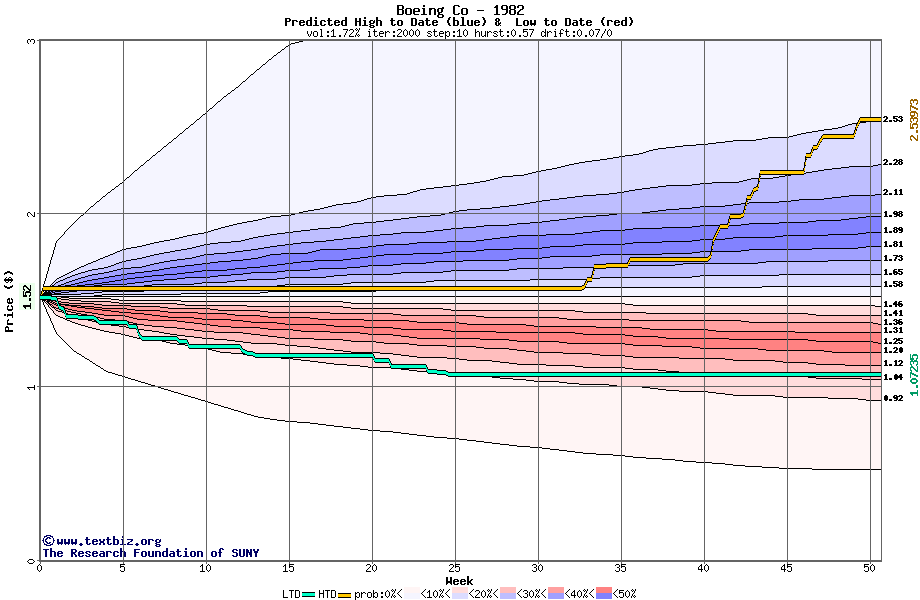 The high to date and low to date prices of the stock plotted against a random walk model for 1982 (what's this?).