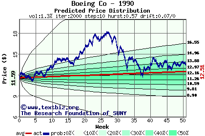 The following graph plots the year-to-date performance of the stock for 1990 compared to the probability calculated by a random walk model.