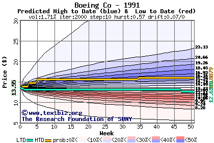 The high to date and low to date prices of the stock plotted against a random walk model for 1991 (what's this?).