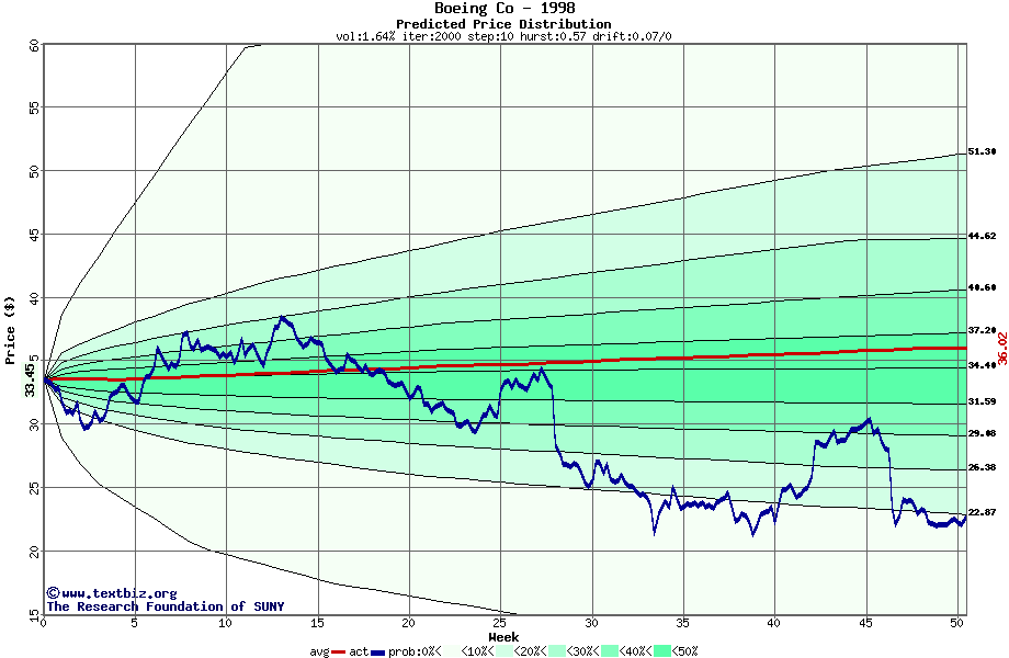 The following graph plots the year-to-date performance of the stock for 1998 compared to the probability calculated by a random walk model.