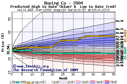 The high to date and low to date prices of the stock plotted against a random walk model for 2004 (what's this?).