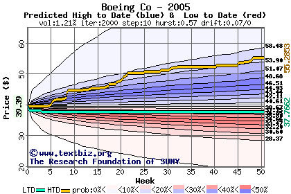 The high to date and low to date prices of the stock plotted against a random walk model for 2005 (what's this?).