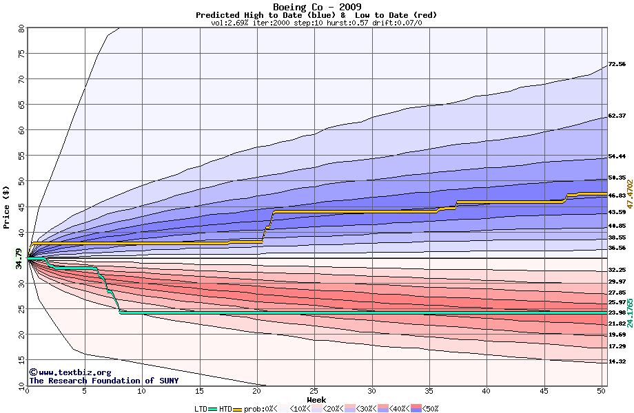 The high to date and low to date prices of the stock plotted against a random walk model for 2009 (what's this?).