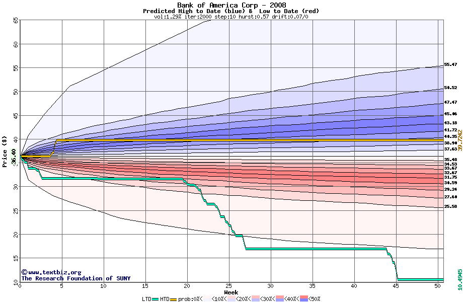 The high to date and low to date prices of the stock plotted against a random walk model for 2008 (what's this?).