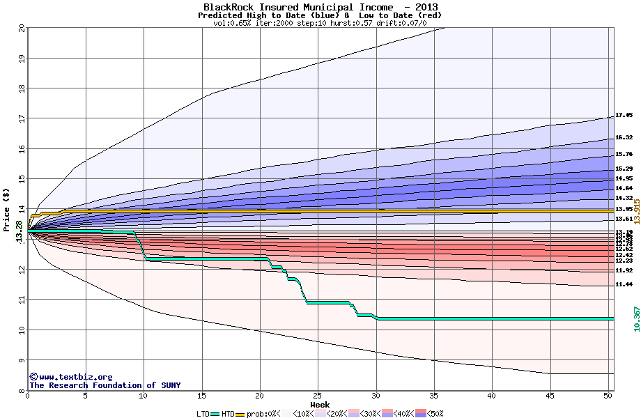The high to date and low to date prices of the stock plotted against a random walk model for 2013 (what's this?).