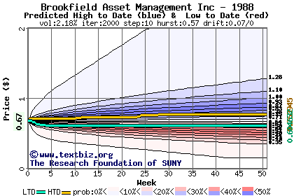 The high to date and low to date prices of the stock plotted against a random walk model for 1988 (what's this?).