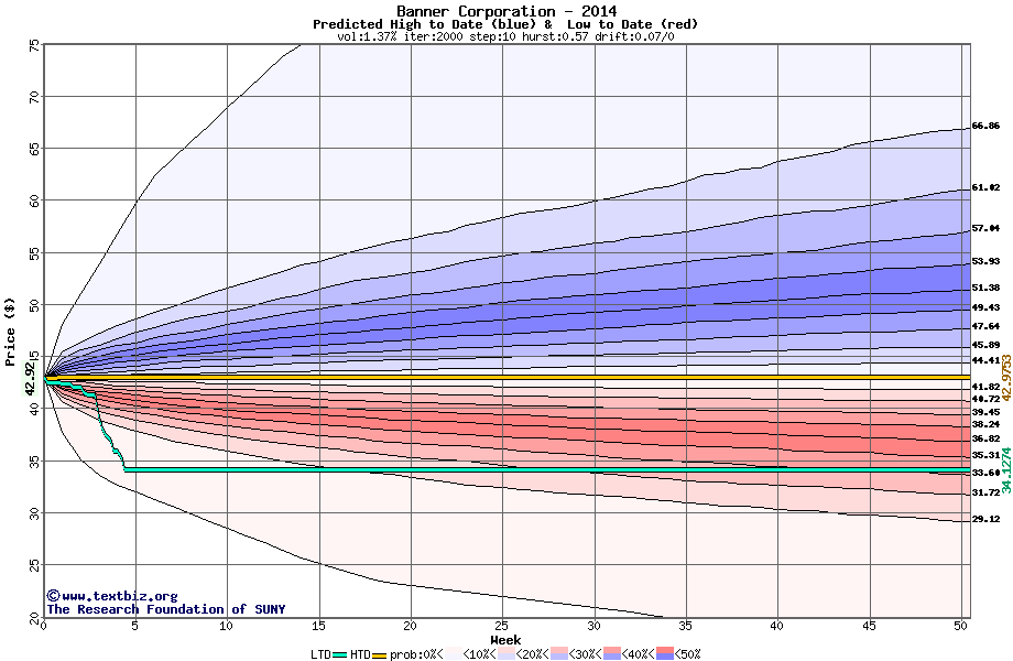 The following graph plots the year-to-date performance of the stock for 2014 compared to the probability calculated by a random walk model.