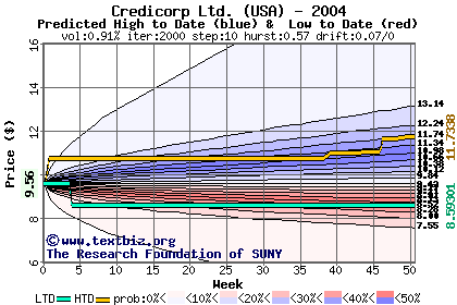 The high to date and low to date prices of the stock plotted against a random walk model for 2004 (what's this?).