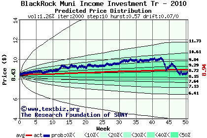 The high to date and low to date prices of the stock plotted against a random walk model for 2010 (what's this?).