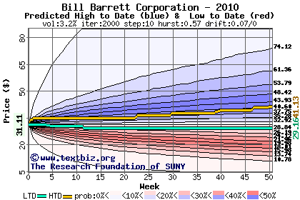 The high to date and low to date prices of the stock plotted against a random walk model for 2010 (what's this?).