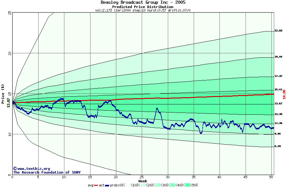 The following graph plots the year-to-date performance of the stock for 2005 compared to the probability calculated by a random walk model.