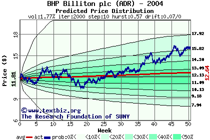 The high to date and low to date prices of the stock plotted against a random walk model for 2004 (what's this?).