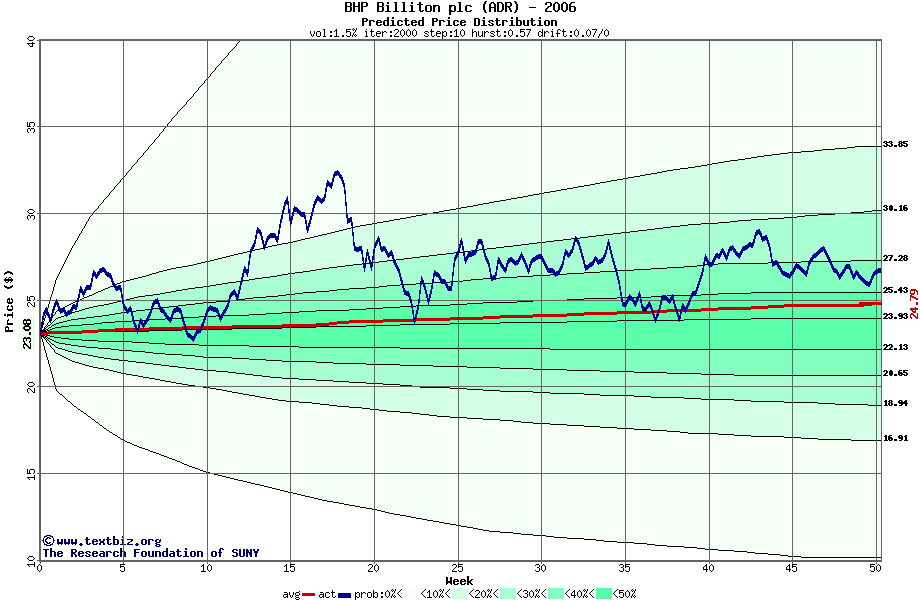 The following graph plots the year-to-date performance of the stock for 2006 compared to the probability calculated by a random walk model.