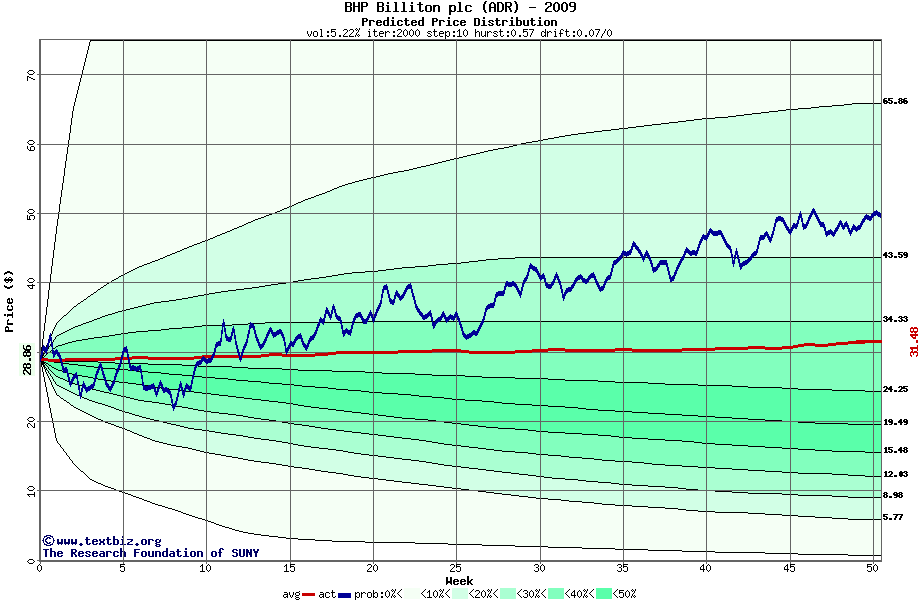 The following graph plots the year-to-date performance of the stock for 2009 compared to the probability calculated by a random walk model.