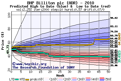 The high to date and low to date prices of the stock plotted against a random walk model for 2010 (what's this?).