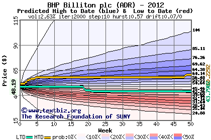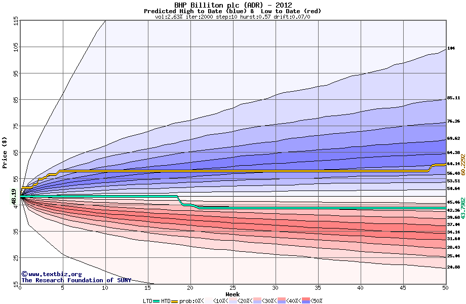 The high to date and low to date prices of the stock plotted against a random walk model for 2012 (what's this?).