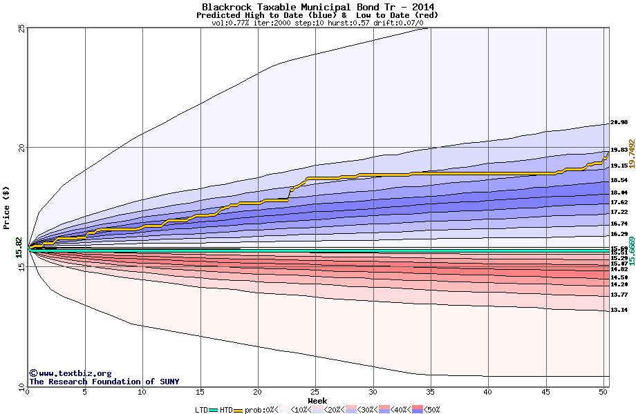 The high to date and low to date prices of the stock plotted against a random walk model for 2014 (what's this?).