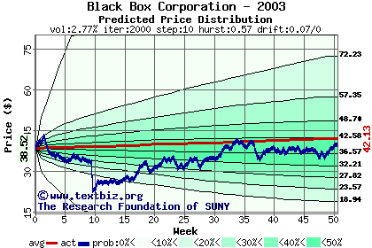 The following graph plots the year-to-date performance of the stock for 2003 compared to the probability calculated by a random walk model.