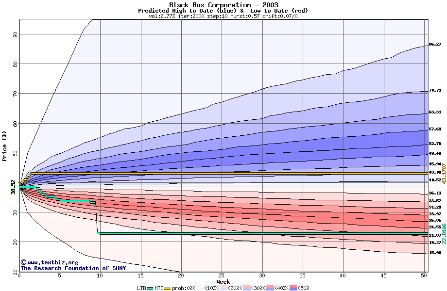 The high to date and low to date prices of the stock plotted against a random walk model for 2003 (what's this?).