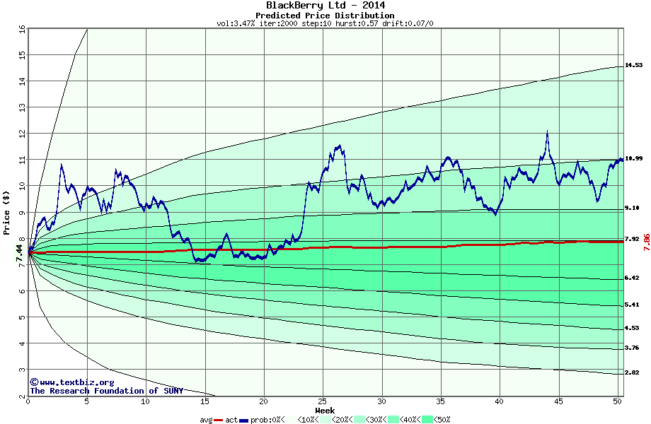 The following graph plots the year-to-date performance of the stock for 2014 compared to the probability calculated by a random walk model.