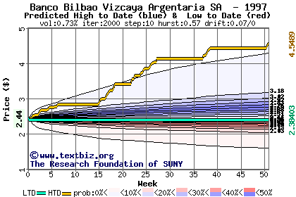 The high to date and low to date prices of the stock plotted against a random walk model for 1997 (what's this?).