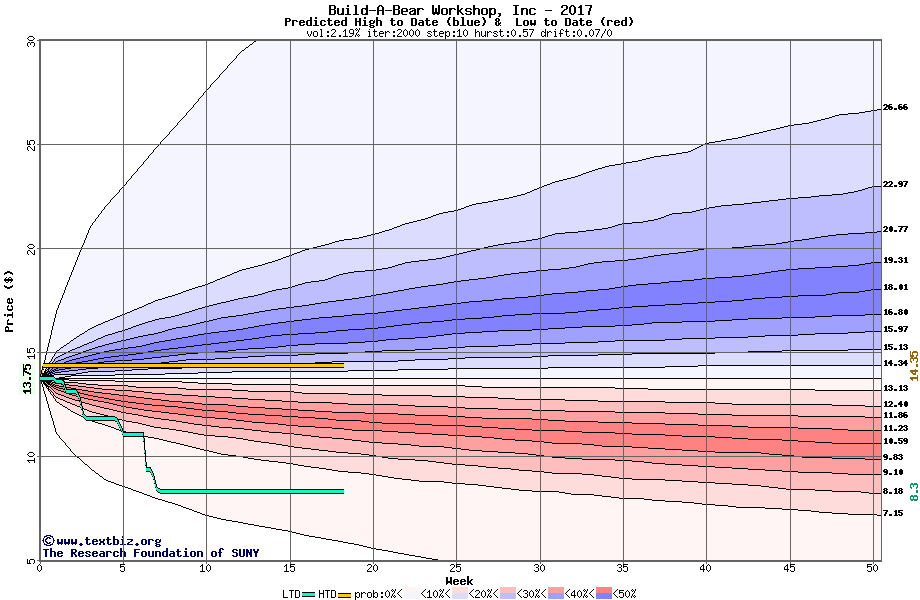 The high to date and low to date prices of the stock plotted against a random walk model for 2017 (what's this?).