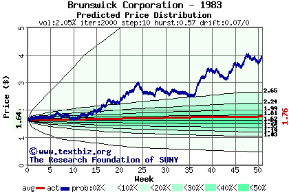 The high to date and low to date prices of the stock plotted against a random walk model for 1983 (what's this?).