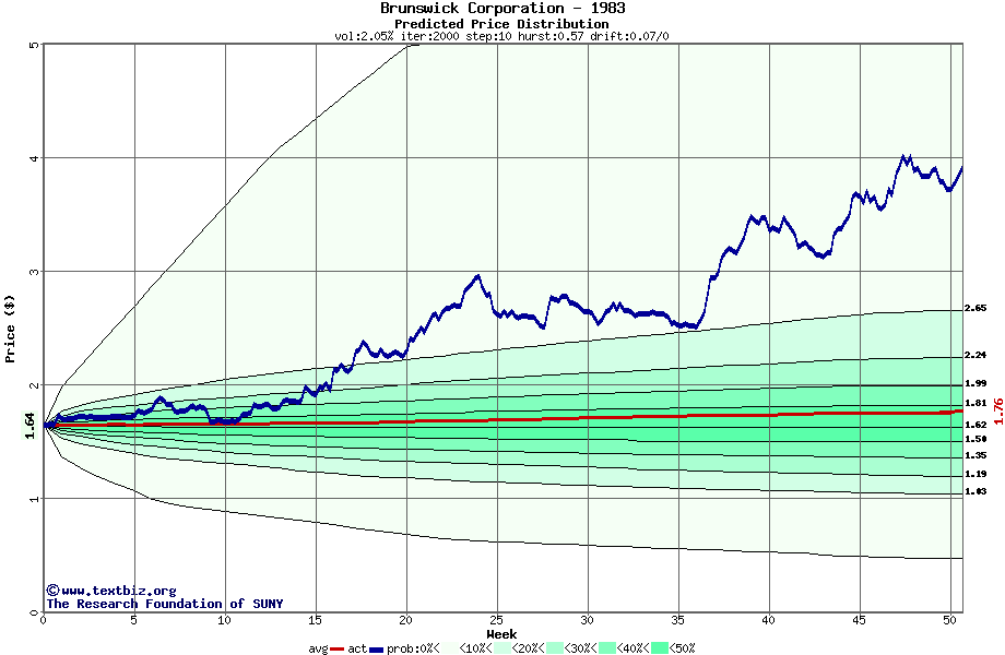 The following graph plots the year-to-date performance of the stock for 1983 compared to the probability calculated by a random walk model.
